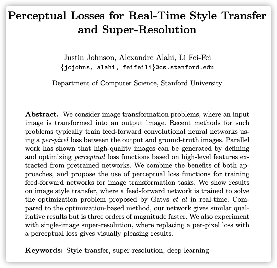 1. Perceptual Losses for Real-Time Style Transfer and Super-Resolution (2016).