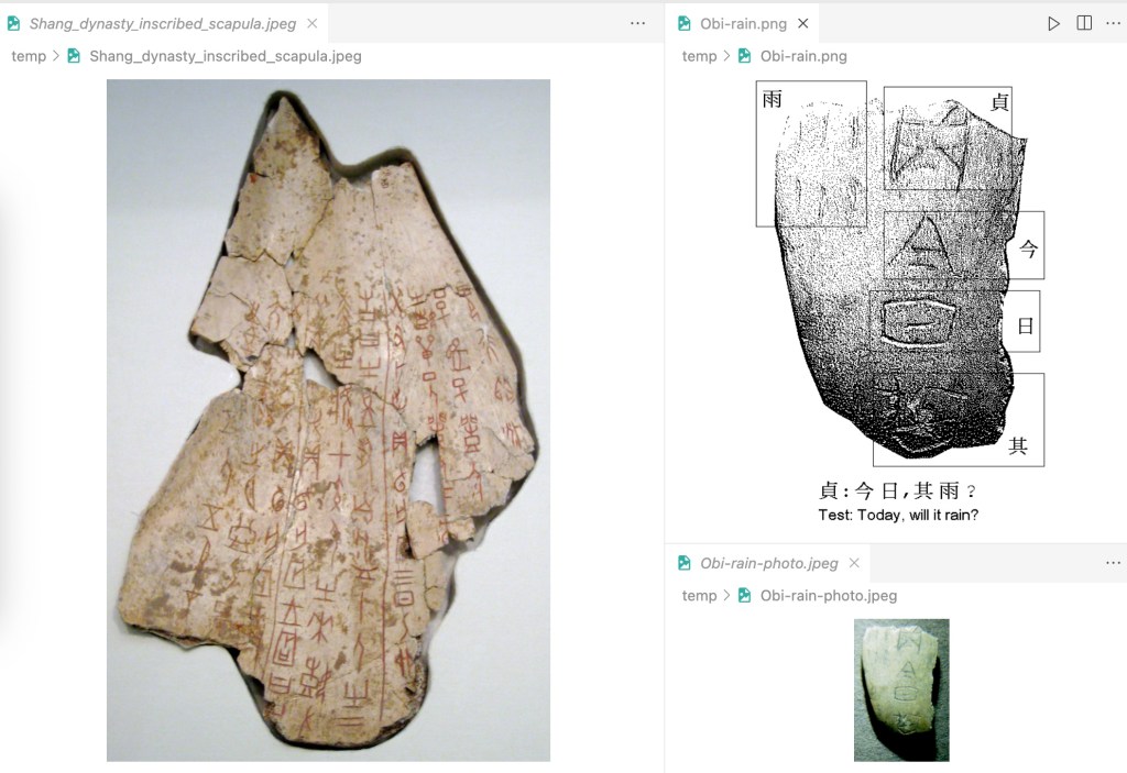 The pre-trained model is located at models/model_best. We can test the model with the sample image. I used the image (3653610.jpg) of the oracle bone script dataset in the Makefile test_model scripts, readers can change it to other images.