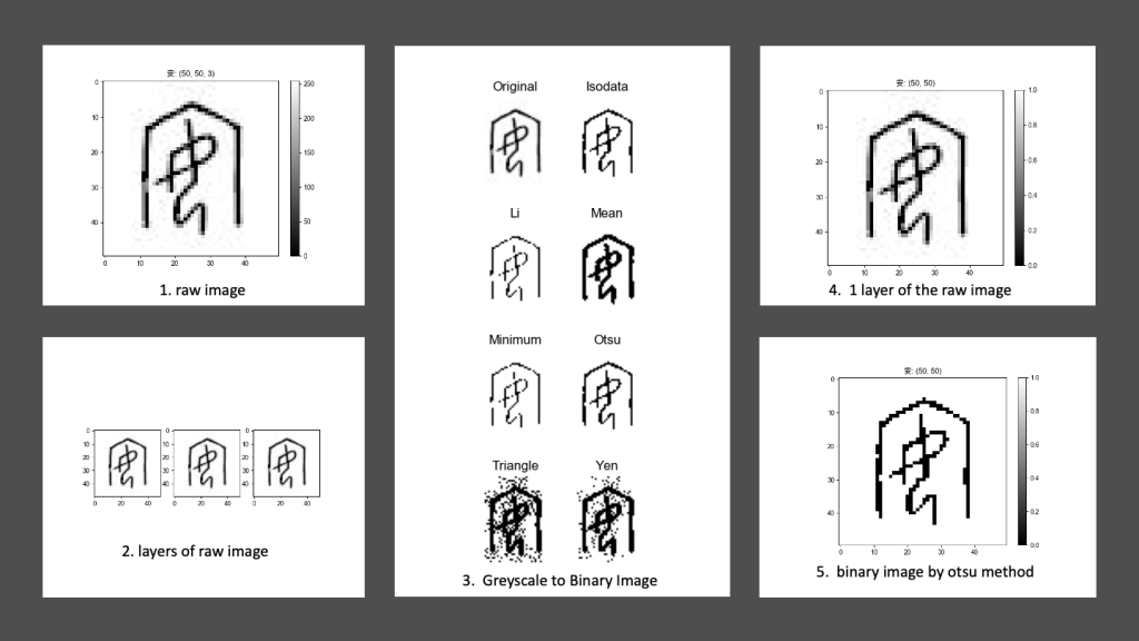 Besides, we show the results of different binarization methods of the original greyscale image with the tool provided by the scikit-image package.