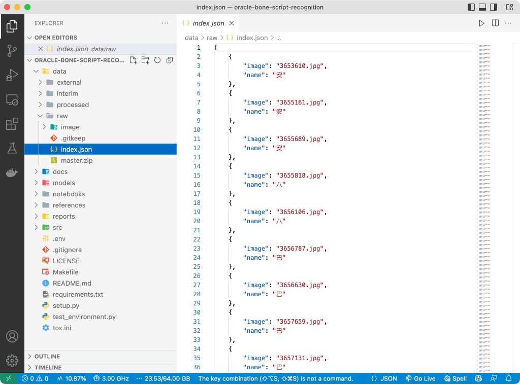 This first challenge is to find a data set with the oracle bone scripts; I found this website 甲骨文 and its GitHub Repo which provided all the script images and image-to-label database I need. The image folder contains 1602 images, and the image name to Chinese character (key-value) pairs are stored in JSON, SQL and DB format, making it the perfect data set for our project startup.