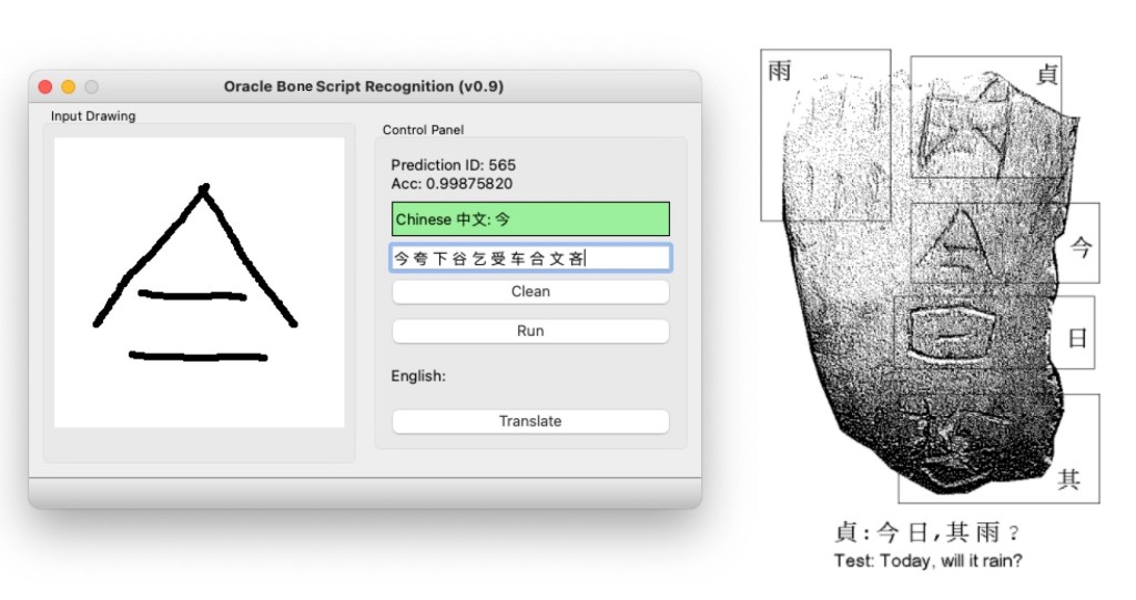 The GUI contains an input drawing window for the user to scratch the oracle bone script as an image.