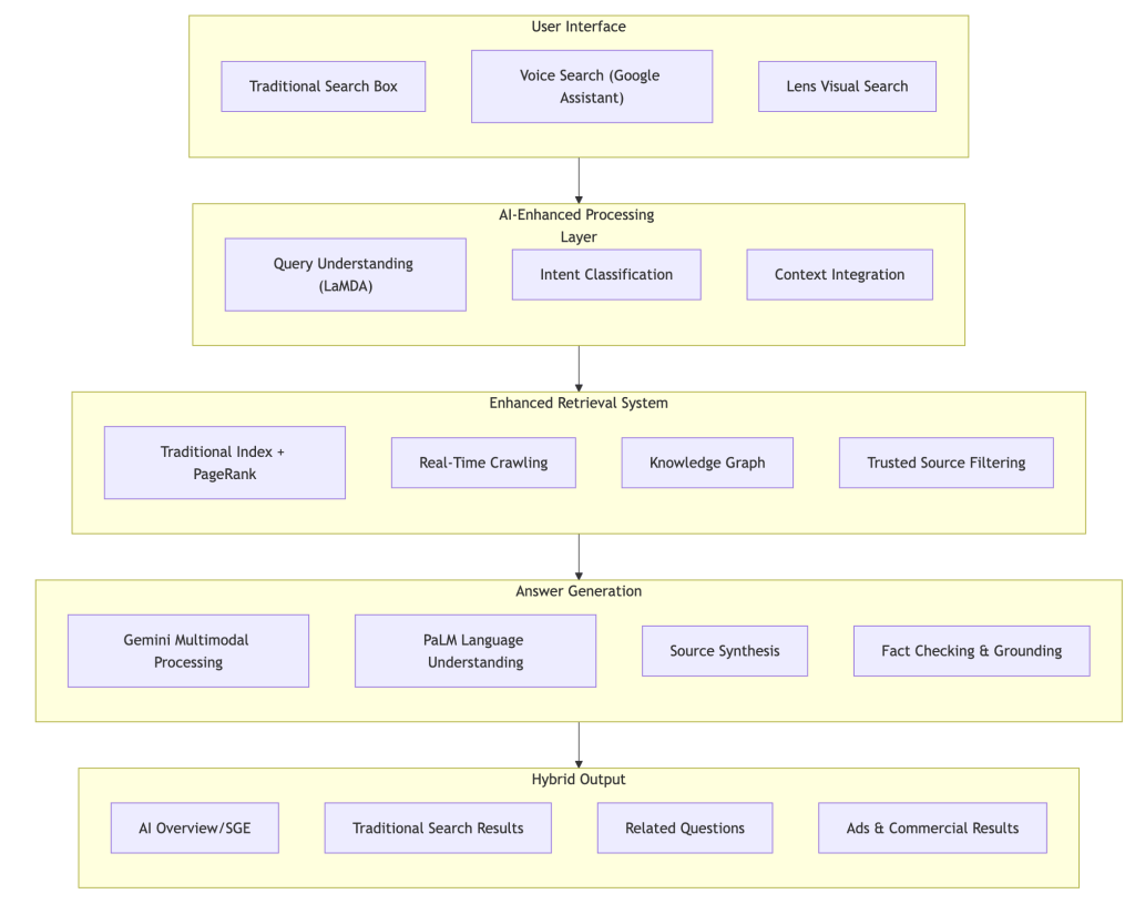 The New Reality: Google has undergone a dramatic transformation from traditional keyword-based search to an AI-driven conversational answer engine. With the integration of Gemini, LaMDA, PaLM, and the rollout of AI Overviews (formerly SGE), Google now synthesizes information from multiple sources into concise, contextual answers—directly competing with Perplexity’s approach.