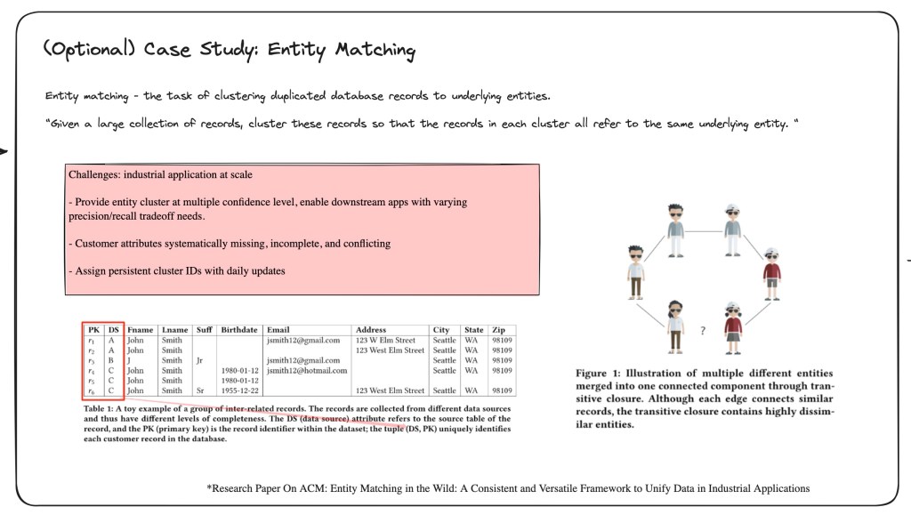 Entity matching – the task of clustering duplicated database records to underlying entities.”Given a large collection of records, cluster these records so that the records in each cluster all refer to the same underlying entity.”