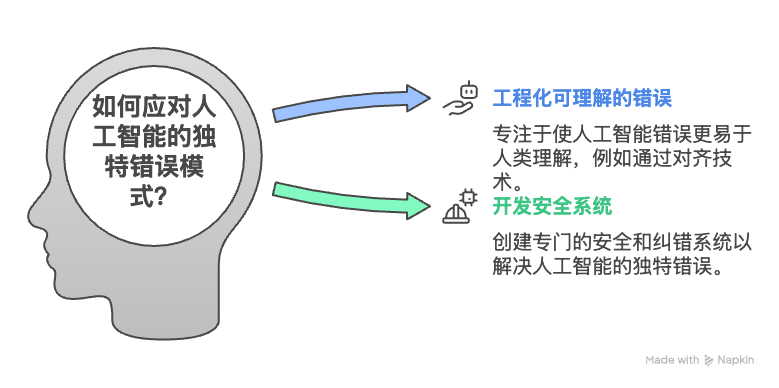 应对人工智能的独特错误模式:布鲁斯·施奈尔(Bruce Schneier)和内森·E·桑德斯(Nathan E. Sanders)(网络安全视角)指出,人工智能系统,特别是大型语言模型(LLMs),其错误模式与人类错误显著不同——它们更难预测,不集中在知识空白处,且缺乏对自身错误的自我意识。他们提出双重研究方向:一是工程化人工智能以产生更易于人类理解的错误(例如,通过RLHF等精炼的对齐技术);二是开发专门针对人工智能独特“怪异”之处的新型安全与纠错系统(例如,迭代且多样化的提示)。