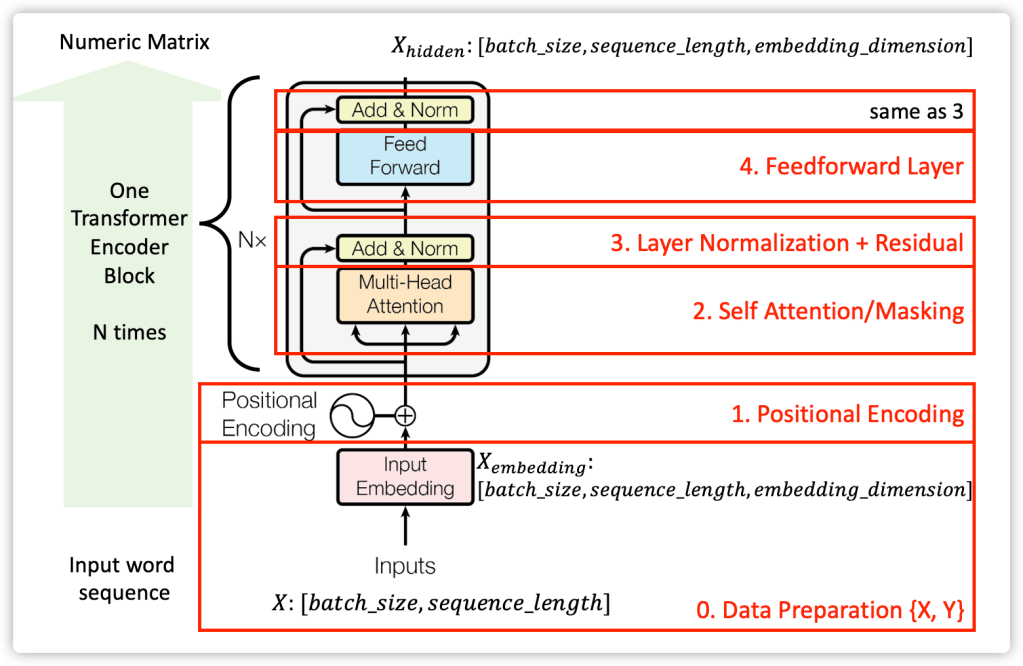 Let us take a close look at the encoder stacks of Transformer. The the following sections will refer to the 0, 1,2,3,4 blocks: 0. Data preparation (word to numbers / input embedding/batch/masking); 1. Positional Encoding. 2. Self-Attention; 3. Layer Normalisation and Residual Connections. 4. Position-wise Feed-Forward Network.